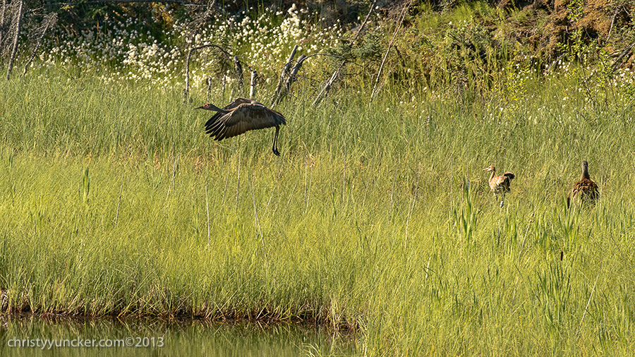 Through June and most of July, Millie and Roy walk with their colt while they forage.In late July, Roy and/or Millie begin to fly short demonstration flights across the nest territory, as Pi watches, sometimes spreading and flapping his wings.