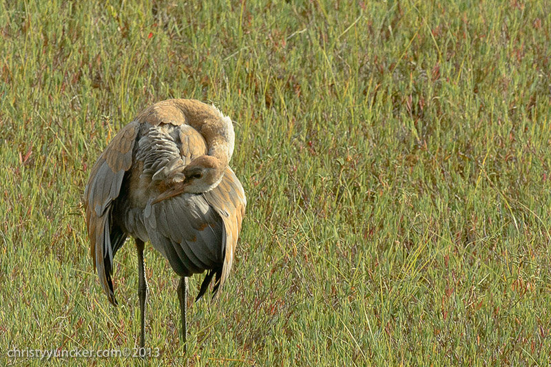 Individual cranes frequently preen their own wing and back feathers. We have never seen Millie and Roy preen one another but preening of another individual (allopreening) is common in parrots. On several occasions in September, when Millie, Roy, and Pi were preening themselves, Pi touched Millie's back feathers, seeming to investigate the uropygial (preen) gland near the base of her tail. Millie discouraged PI's investigations.