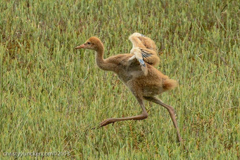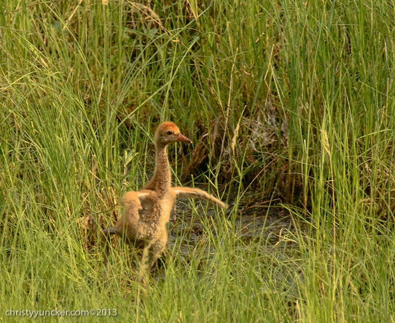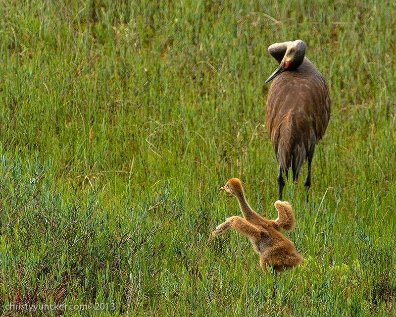 Dancing bouts, that usually start with wing-waving by the young colt, are common in the first month, as seen in earlier Photo Galleries. At about 6 weeks, the parents start "demonstration flights" across the pond or circling it once or twice. We think these flight help motivate the colt.