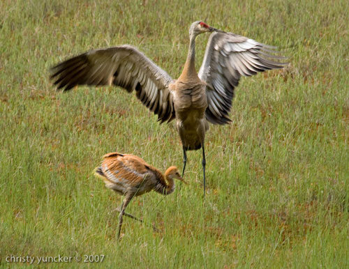 FLIGHT TRAINING - Flying requires strength, coordination, practice, and flight feathers. From the early days, colts walk about with their parents and flap their tiny rudimental wings. Pre-flight training involves running, flapping, and then, as the wing feathers fill in, bounding to facilitate gliding. Both dance training and pre-flight training prepare the youngsters for the first flights and the fall migration. By late summer, the family often takes increasingly-longer day trips and even overnights in nearby ponds.