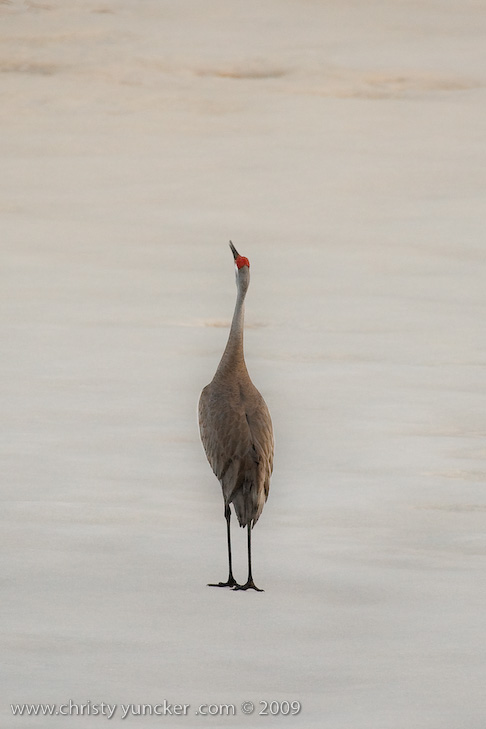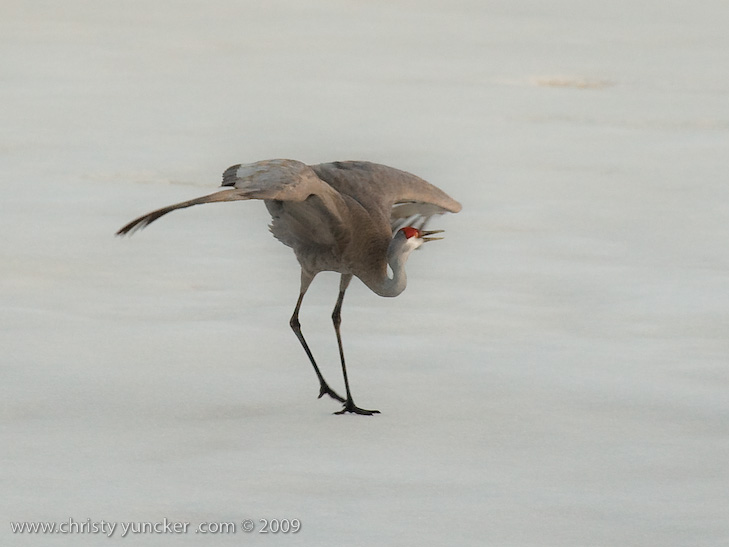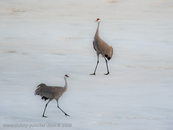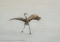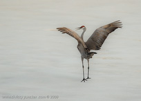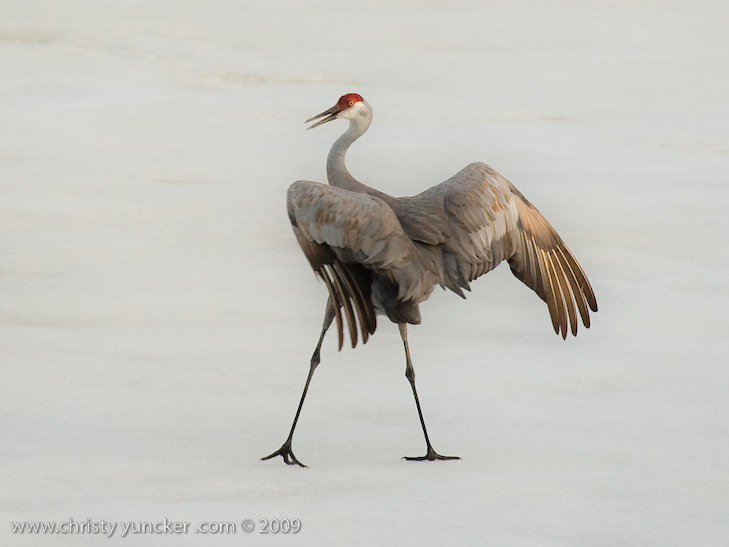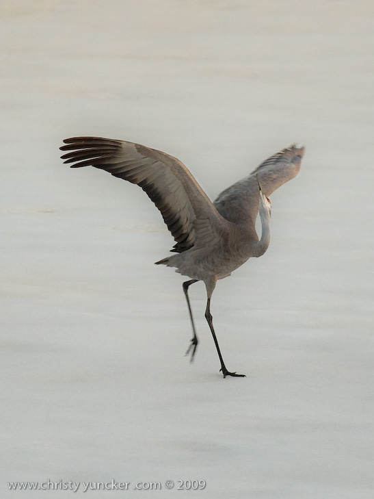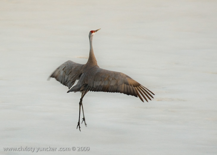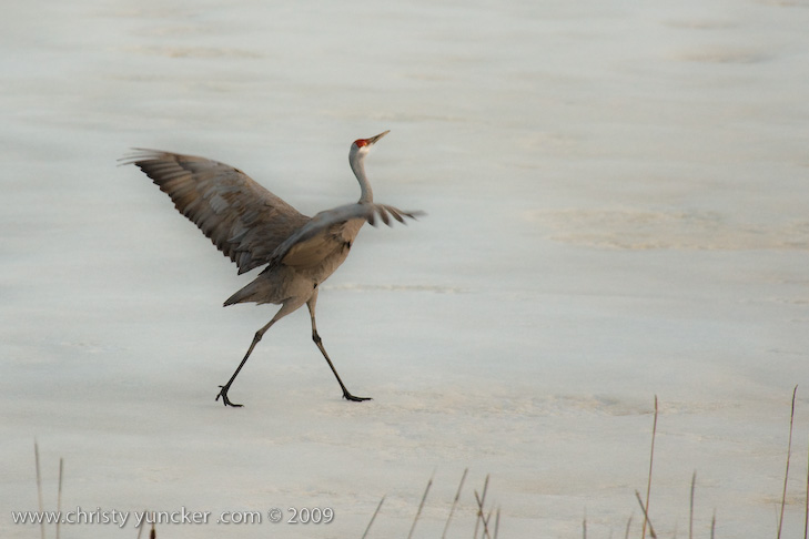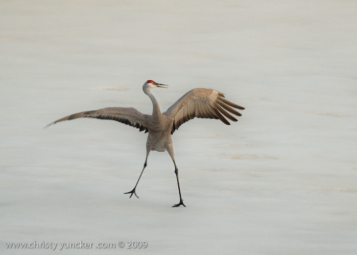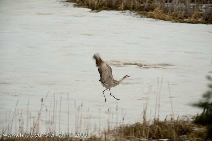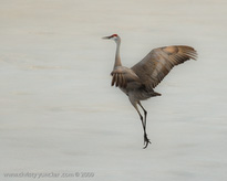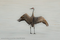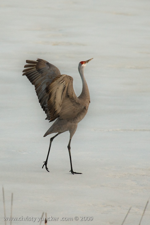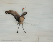 On April 29, 2009 at about 9:30 PM, Roy and Miliie returned from the migration and landed at their traditional nesting site on the cranberry bog . After some unison calling, Roy walked onto the frozen pond and danced. See also Alaska Sandhill Crane Blog, blogpost of June 11, 2009. The tour jete depicted here is similar to one that Roy danced with Barbaro (a colt) in August 2006 (tour jete link).