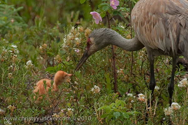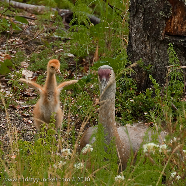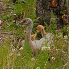 In 2010, Roy and Millie returned from migration on April 22. They began incubation on May 4 and the colts hatched on June 4 (Lucky) and June 5 (Chance). The two colts did well in their first week. By the end of the second week, Lucky (first-hatched, we think) was distinctly larger than Chance. See also Alaska Sandhill Crane Blog.