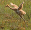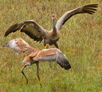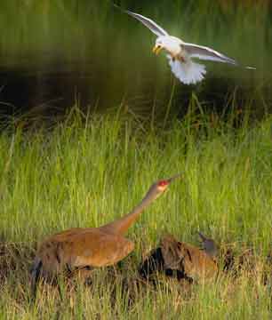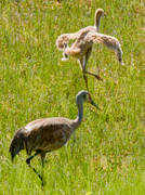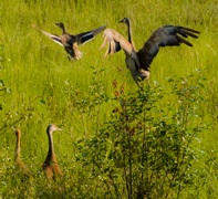 - Caution - In their first weeks, colts are especially vulnerable. The parents are particularly wary when ravens, northern harriers, or mew gulls are nearby. Whenever a predator is detected, colts crouch down in the grass, often under their mother. If the predator approaches, the parents defend vigorously, as seen in the left photograph which shows Millie shielding the colts (Jacques-09 and Phyl-09) and Roy Bill-stabbing at a mew gull. The mew gulls had nested within 30 meters of the crane nest. By midsummer, their gull chicks had become colt food and the adult gulls deserted the pond.