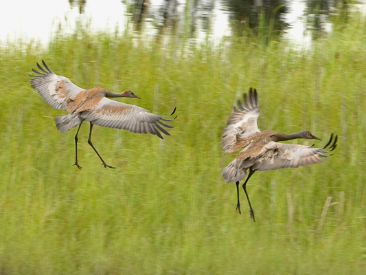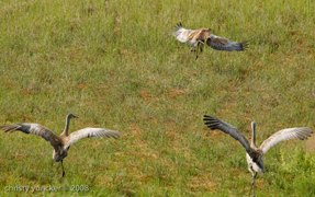 On several occasions, other groups of cranes fly over, perhaps reflecting preliminary gatherings as a prelude to staging. Roy and Millie call energetically and may take flight, with the colt, to join the "intruder cranes". It is not clear whether they are chasing the intruders or forming a transient social relationship.