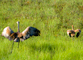 - Foraging - Adults forage for insects, voles, ducklings (Roy appears to be offering a strip of fresh duckling to Lucky-10 at the right), berries, or grain. Adults "butcher" the duckling by vigorously shaking its carcass back and forth and bits of meat are then fed to the colt. In the 4th week, colts feed independently on berries and grain and appear to look for insects in the grass.