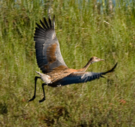 The parents precede their take-offs by an "intent-to-fly" display and then take flight, with colt following. On the outbound flights and on return (one to ten hours later), the parents often unison-call repeatedly. The colt follows a crane-length or two behind; they descend and land in the middle of the nest territory. In the photo to the right, Oblio-08, with an injured leg drooping slightly, is seen flying off with the adults on of these excursions. In weeks 12 and 13, the colt may give the intent-to-fly signal for an excursion.